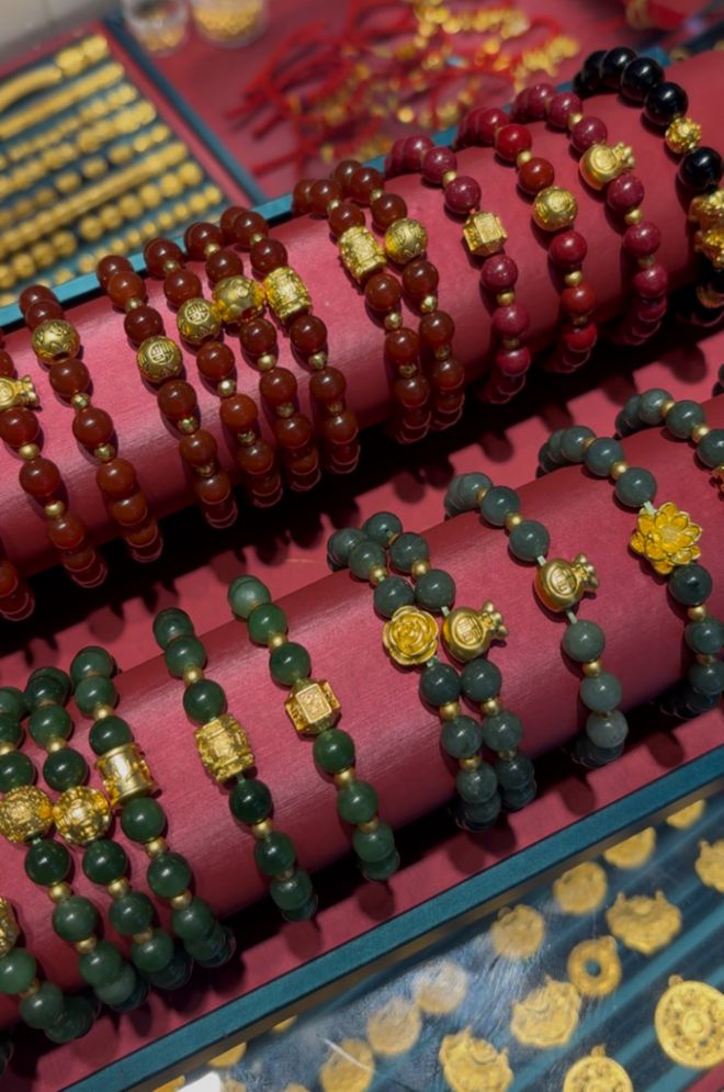 除黄金饰品外,款式多样、价格亲民的白银、珠宝首饰也同样“水涨船高”,在近期迎来销量高峰。柜台内,和田玉、玛瑙、石榴石等各式珠宝饰品陈列整齐,颜色温润,吸引了不少消费者驻足。