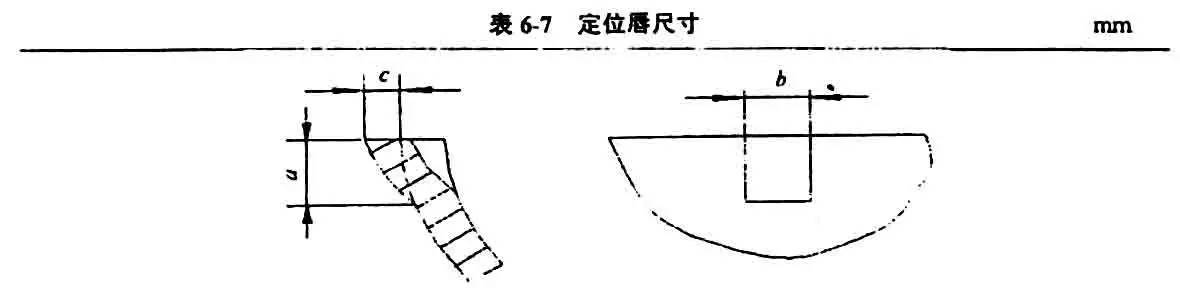 定位唇尺寸的推荐值见表6-7。定位唇不应设在轴瓦中部,使上下瓦有所区别。定位唇边距油槽边缘、轴瓦前后边缘和翻边内侧的距离不得小于2mm。在普通轴瓦中,也可设于瓦宽的一侧,使一个唇边与瓦边重合。