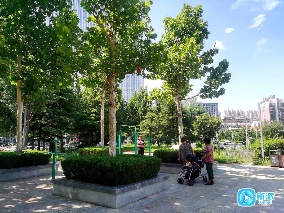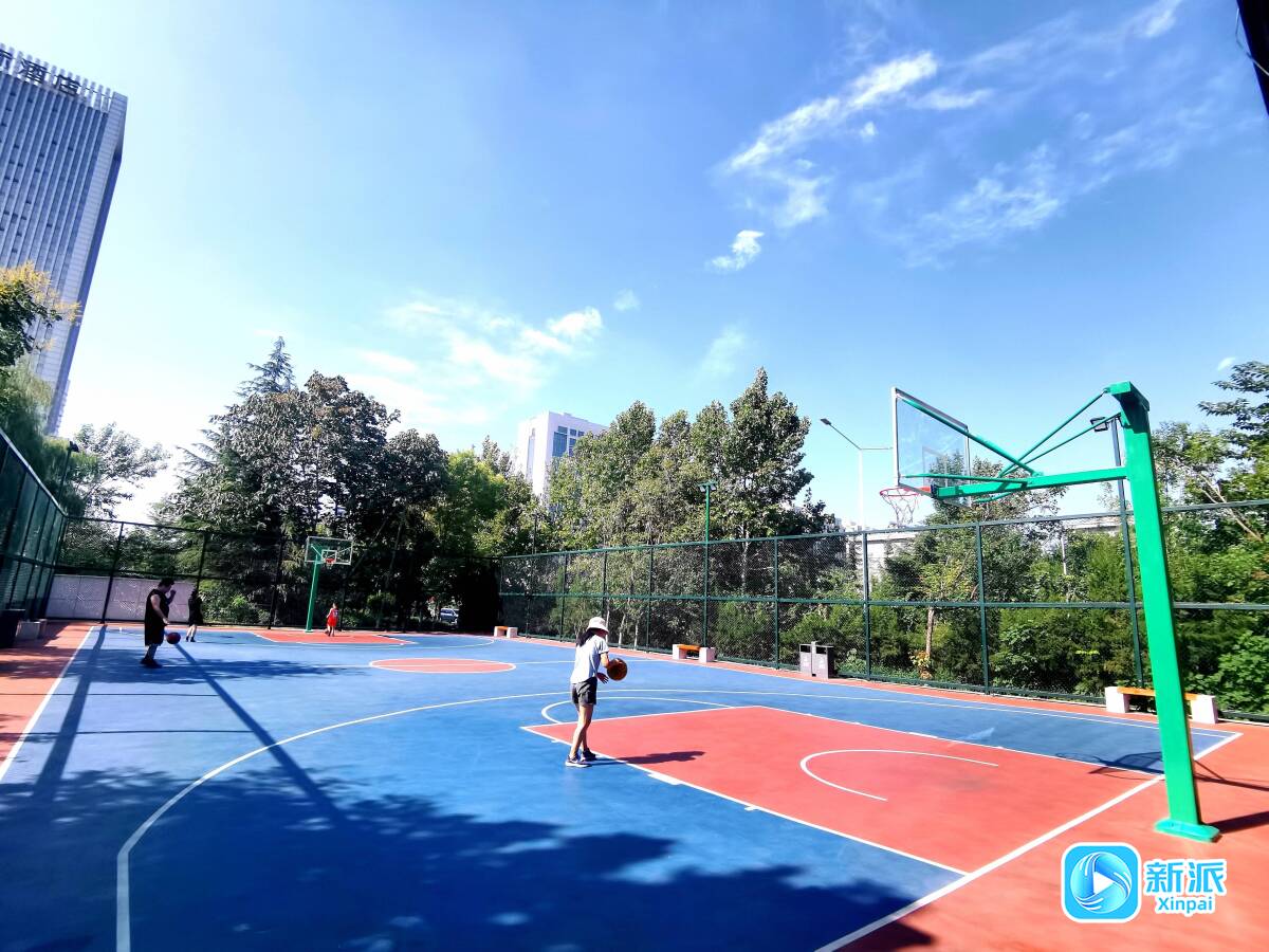 拾级而上,是公园的休闲广场,四周栽种着不少高大树木。树荫遮蔽下,形成一块块清凉空间。长条座椅上,居民休闲地下棋、聊天、遛娃,惬意之感油然而生。休闲广场两侧的林荫道,设置有各式各样的健身器材,可供游人休闲锻炼。公园一角还有一处大型篮球场,市民在此打球运动,享受健康生活。